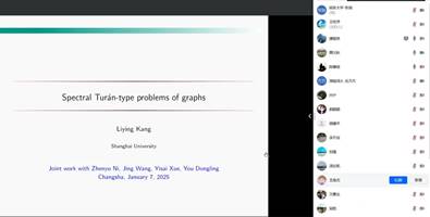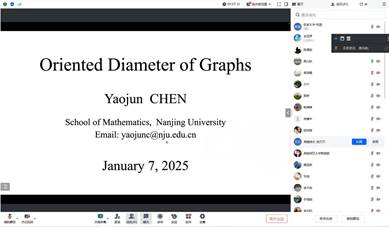 康丽英教授以“Extremal Problems for Disjoint Graphs”为题进行了报告,详细介绍了图兰问题与谱图兰问题之间的关系研究进展,并证明了一个重要结论:谱图兰的极图必定是相应图兰的极图。陈耀俊教授以“Oriented Diameter of Graphs”为题进行了报告,详细阐述了定向直径问题的核心概念、研究背景以及当前的研究进展。报告中,陈教授不仅分享了团队在该领域的最新成果,还深入分析了问题的解决思路与证明过程,展示了定向图结构与直径问题之间的紧密联系及其理论价值。