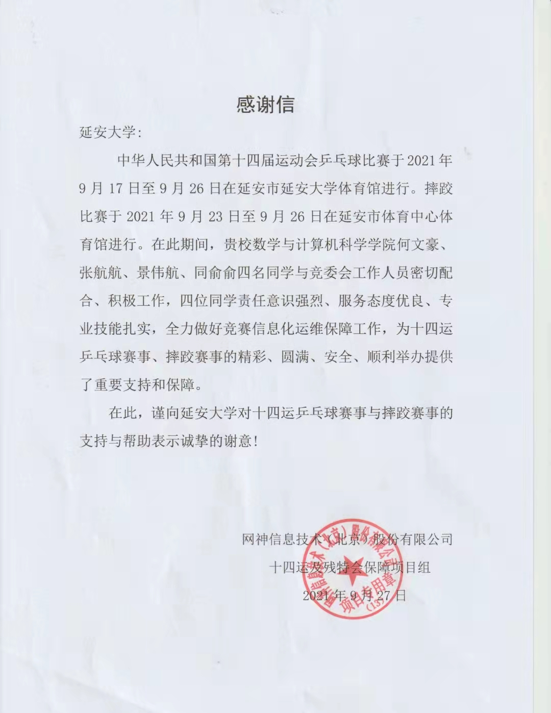 日前,我校必发集团大四学生何文豪、景伟航、张航航、同俞俞等四名同学收到来自“网神信息技术(北京)股份有限公司、十四运及残特会保障项目组”的感谢信,内容如下: