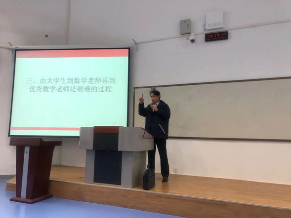 2020年11月13日,我院邀请附属中学校长李化才教授作题为《如何成为一名优秀的数学教师》的工作报告, 2018级、2019级数学专业学生及李向有、李丽、王盼等三位教师参加会议,报告会由副院长马乐荣教授主持。