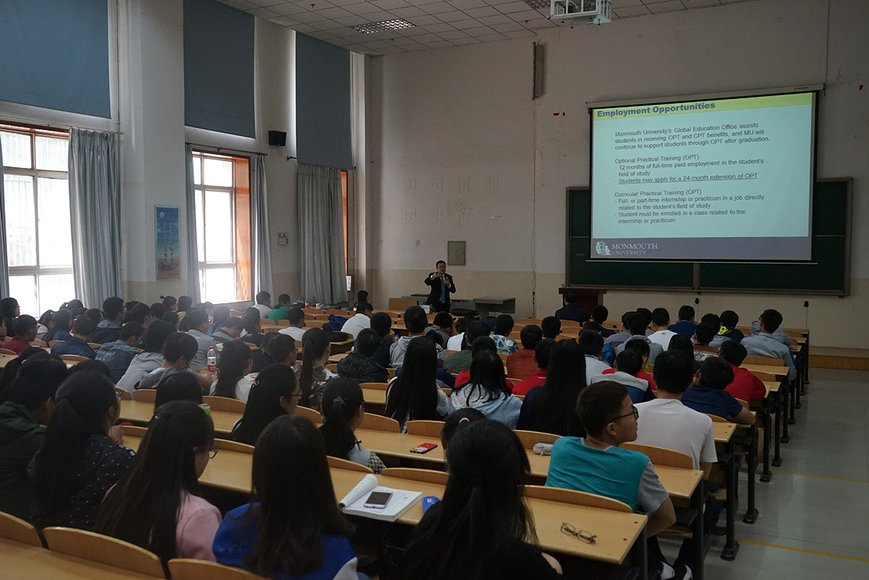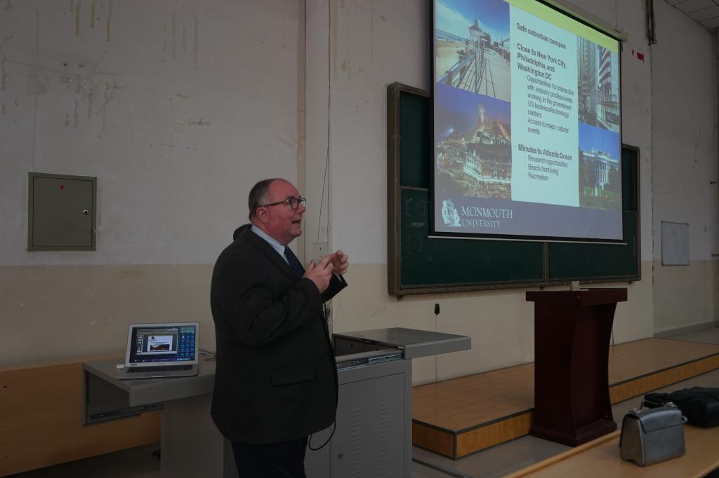 8日下午,乔▪斯达夫一行在玉章楼第五阶梯与计算机学院计算机科学与技术及相关专业师生就两院合作培养计算机科学、软件工程、信息系统方向硕士研究生的相关问题进行了互动交流,交流会由计算机学院副院长王文发主持。交流会上,乔▪斯达夫首先介绍了蒙莫斯大学的办学情况,理工学院首席教授王加存博士从蒙莫斯大学理工学院目前与国内高校开展合作培养硕士研究生情况、专业设置、课程设置、学习生活、就业等五个方面与我校计算机学院学生进行互动交流。