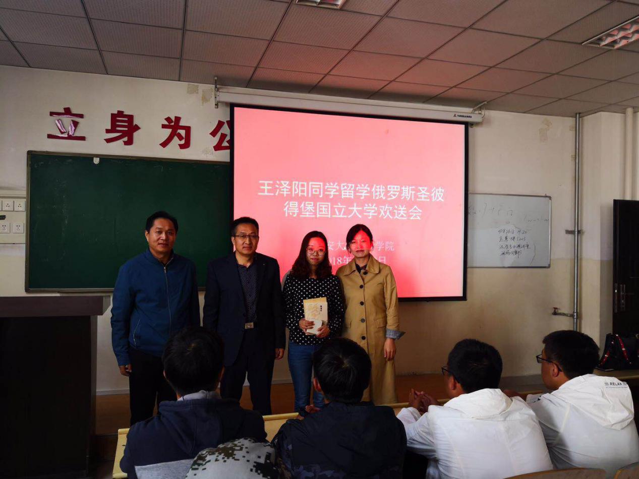 王文发院长讲话中指出,学院近年来极力加强人才培养的质量,探索和推动人才培养的特色化,效果显著,学院人才质量和学院社会声望逐年提升。学院注重与国内名校和世界著名大学间的合作交流,近年来我院学生越来越多的到国内名校和世界名校进行短期学习和读研、读博,这极大的丰富了学院人才培养体系;王泽阳同学作为学院第二名前赴圣彼得堡国立大学深造的本科生,说明世界著名大学对我院本科生教育质量的认可;希望全院同学向王泽阳同学等优秀学生看齐,努力学习,将自己培养成祖国建设的合格建设者和可靠接班人。