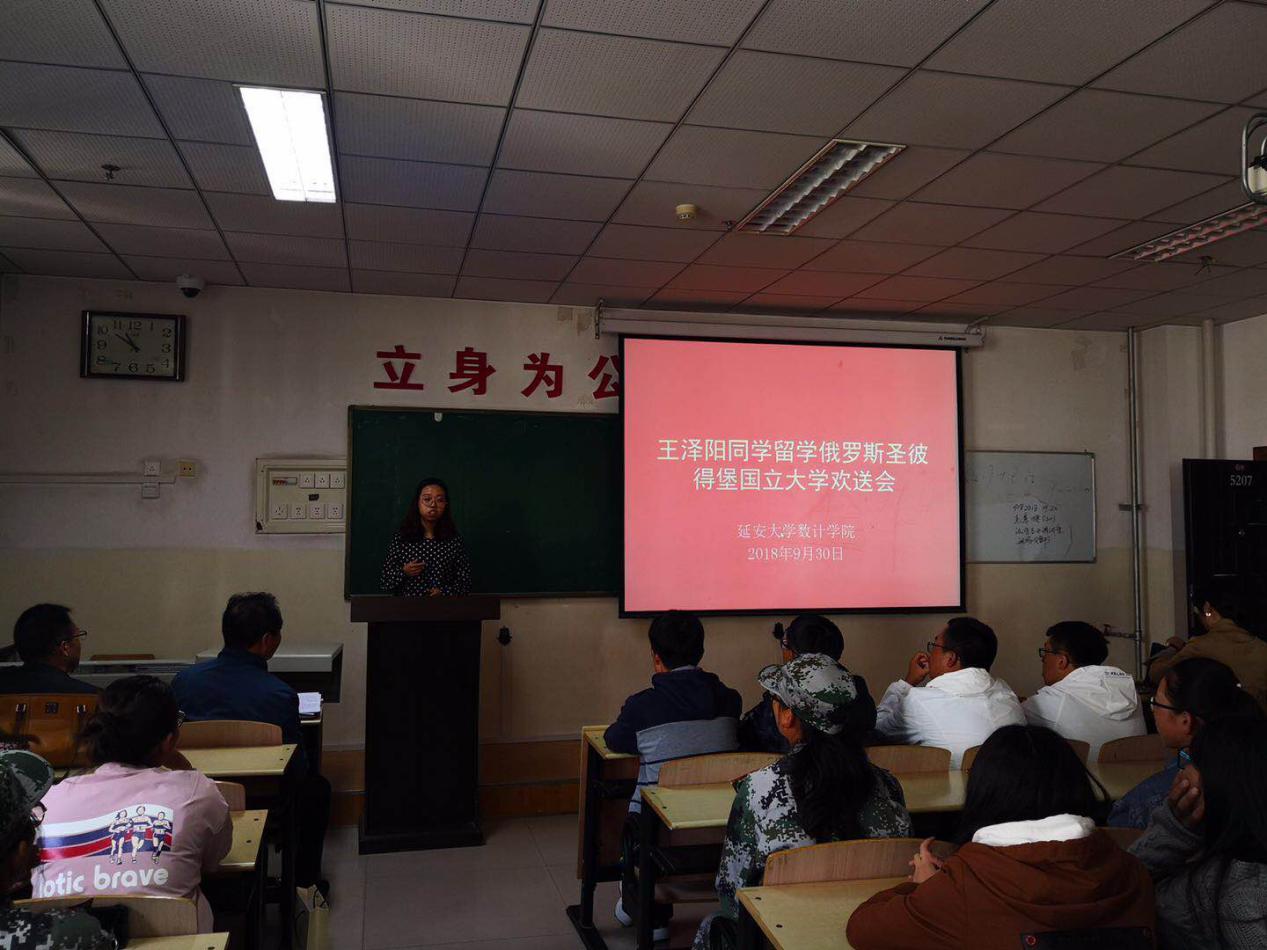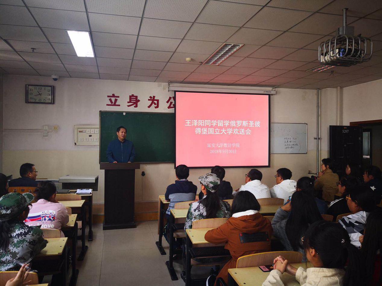 经过严格筛选和学院积极推荐,我院数学与应用数学专业2014级本科生王泽阳同学,日前成功通过俄罗斯圣彼得堡国立大学和俄罗斯教育部的审核,被录取为俄罗斯圣彼得堡国立大学应用数学专业硕士研究生(公费)。9月30日上午10点,学院为王泽阳同学召开了主题欢送会,学院党政领导、老师和数学与应用数学专业2018级130余名同学一同欢送参加欢送会。院党委副书记崔林立主持了欢送会。