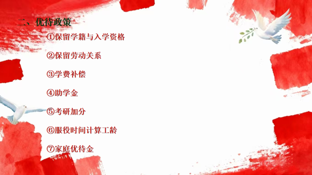 在生动的分享之外,两位同学还化身“政策宣讲员”,对大学生应征入伍的各项优待政策进行了条理清晰的梳理: