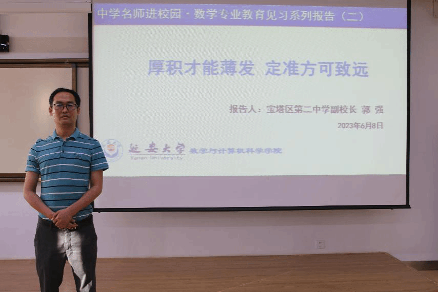 郭强副校长的报告题目为“厚积才能薄发 定准方可致远”。在报告的开头,郭校长向学生提问:“你要做一名怎样的老师?”之后,郭强副校长根据国家对教师的新要求,指出一名优秀教师应具有人格魅力、专业知识、教学艺术、教学理念;结合自身工作经验分享了教师专业成长的基本规律、策略方法、提升途径。他希望同学们在大学期间能多读书、多学习,要了解普通高中数学的课程标准及高考评价体系及说明,能够在后续的教学技能训练中多听课,多实践,在教学训练中还要多反思,多记录,了解自身的不足和优点,通过不断反思,改进不足,不断成长。最后,郭校长以微课《极坐标与直角坐标的互化》为例,强调引课时要注意联系实际,能吸引学生注意,内容讲解要首尾呼应,结论要能推广。郭校长的报告能始终吸引学生的注意力,内容具有可操作性,受到学生的不断好评。