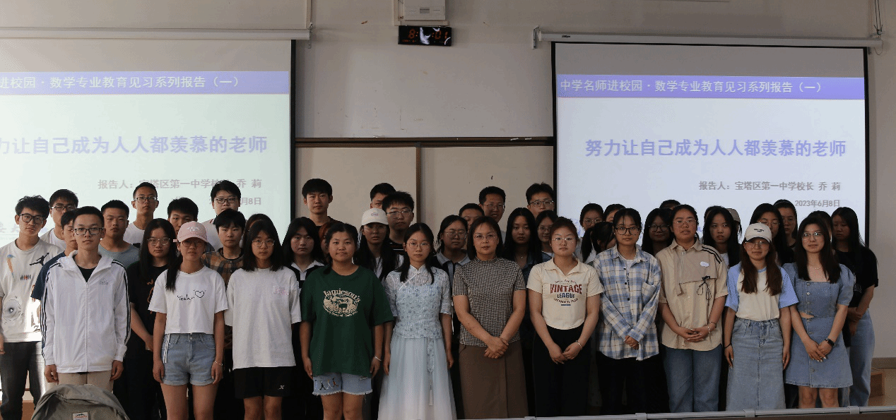 为加强师范生对中学数学教师职业的理解和认同,沁润教育情怀和立德树人理念,2023年6月8日下午,学院邀请宝塔区第一中学乔莉校长和宝塔区第二中学郭强副校长分别为数学21级和22级全体同学做职业认知报告,马乐荣副院长、系主任李向有、副主任郭婵婵老师主持并听取了报告。