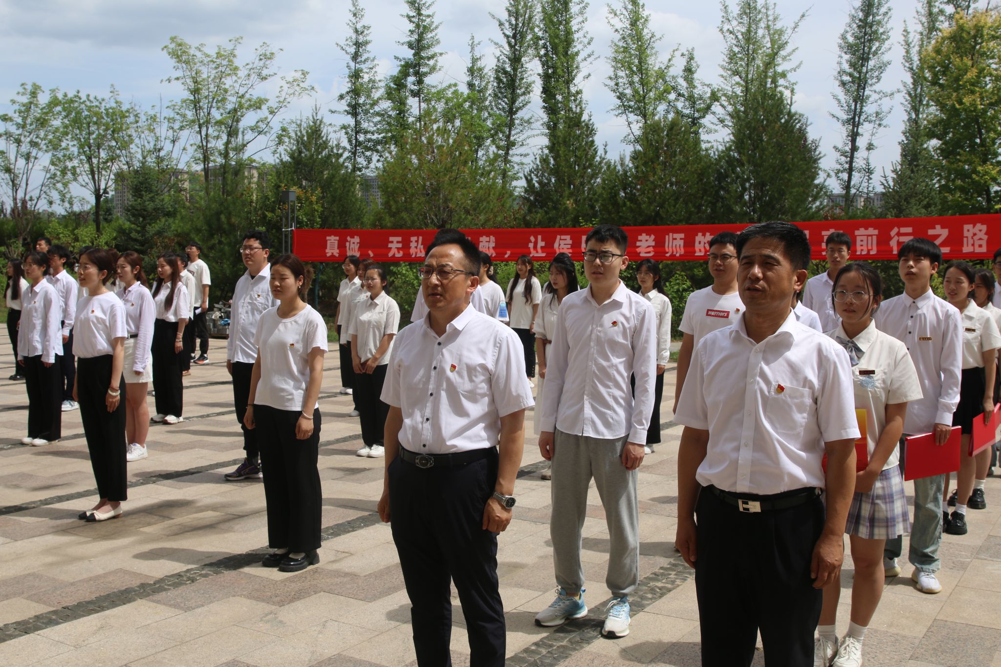 院党委副书记崔林立寄语2023届毕业生党员,号召同学们要将延安精神带到祖国各地,带着真诚、无私、奉献,传承侯明书老师精神,争做具有延安精神特质的时代新人。退伍毕业生党员王政同学带领毕业生党员在党旗下庄严宣誓,重温入党誓词,牢记初心使命,强化党员意识。