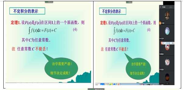 结合数学分析课程特点,课程组挖掘课程中蕴含的科学严谨的治学精神,“细节决定成败”的做人、做事道理,以及防疫离不开各项细致工作的思政元素,鼓励同学们将自己的理想融入到中华民族复兴的伟大事业中,培养学生的爱国情怀和社会责任感。