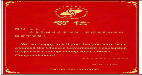 2021年12月30日,接到2021届16名毕业生在俄罗斯圣彼得堡国立大学攻读硕士学位的喜报,7名同学经过专家评审,获得国家公派留学资格和国家留学基金管理委员会全额奖学金资助(每月1300美元,覆盖硕士研究生2年学制阶段),4名同学获俄罗斯政府全额奖学金。