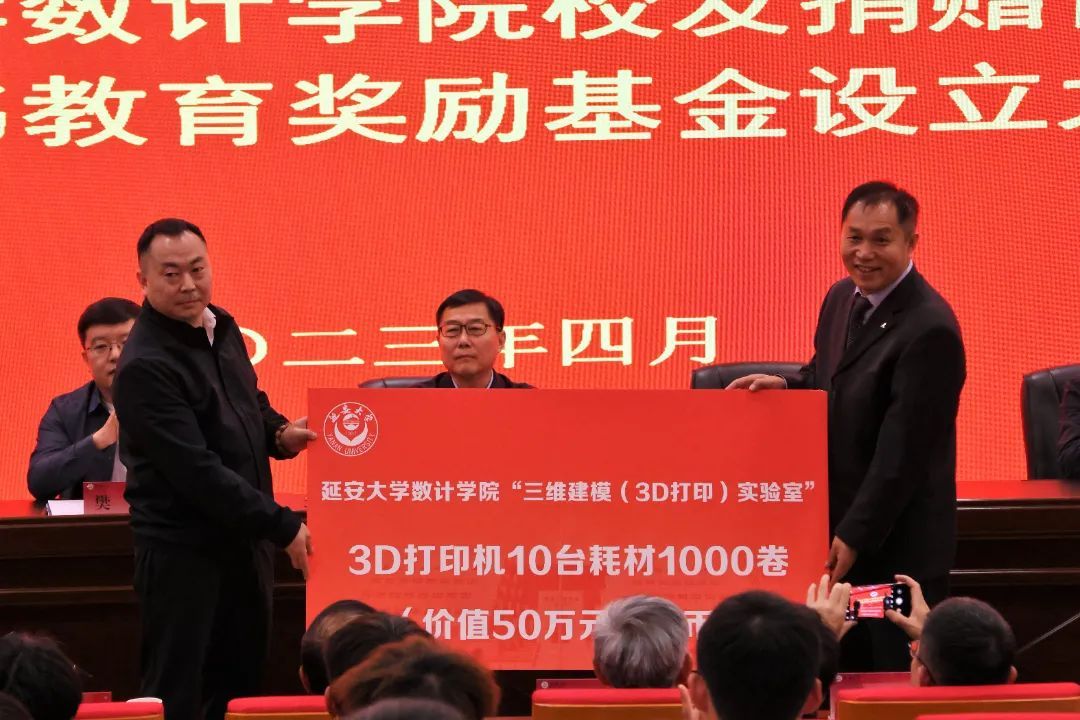 捐赠仪式上,信息技术1996级校友、武义斯汀纳睿三维科技有限公司总经理张晓军向必发集团捐赠3D打印设备一批(价值50万元整,包含10台3D打印机及1000卷打印耗材等);数学与应数学2001级校友、内蒙古锦泰能源(集团)有限公司总经理樊军向必发集团“侯明书教育奖励基金”捐款50万元人民币,王文发院长和李法周副处长分别接受了捐赠。随后陈华副书记代表学校向两位校友分别颁发了捐赠证书;张翔部长向两位校友分别颁发7790.cn必发集团校外辅导员聘书及“‘7790.cn必发集团名师导航工程’校外辅导员”工作牌。