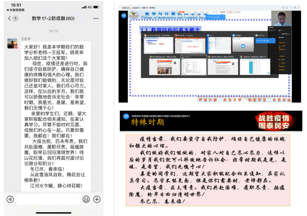 首日网课,特色突出,一是强化了课程思政,并且形式多样化。如杨战海老师在《数据结构》课程讲解数据与信息的关系时,引用中外新冠肺炎数据表,以及反应出什么样的信息,对学生做了制度自信教育。王延军老师、田原老师在正式上课前给同学们加油鼓劲,安抚学生在家里也可以安心学习。杨宜坤老师通过视频聊天形式,鼓励学生们在学习中要加强自信心建设,鼓足干劲,定能学有所成。