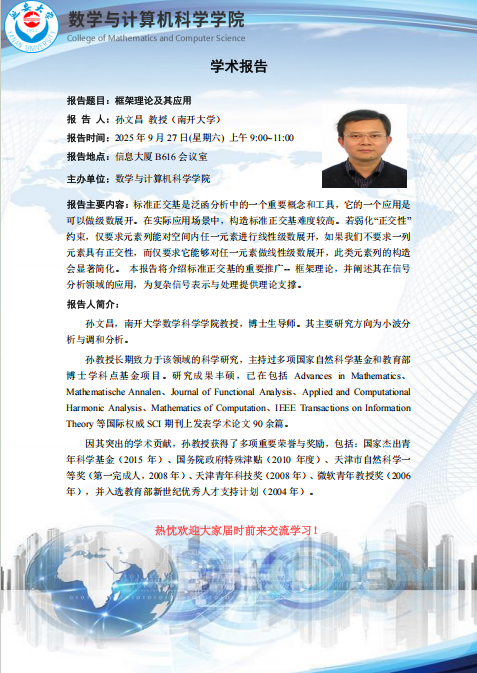 报告主要内容:标准正交基是泛函分析中的一个重要概念和工具,它的一个应用是可以做级数展开。在实际应用场景中,构造标准正交基难度较高。若弱化“正交性”约束,仅要求元素列能对空间内任一元素进行线性级数展开,如果我们不要求一列元素具有正交性,而仅要求它能够对任一元素做线性级数展开,此类元素列的构造会显著简化。 本报告将介绍标准正交基的重要推广——框架理论,并阐述其在信号分析领域的应用,为复杂信号表示与处理提供理论支撑。