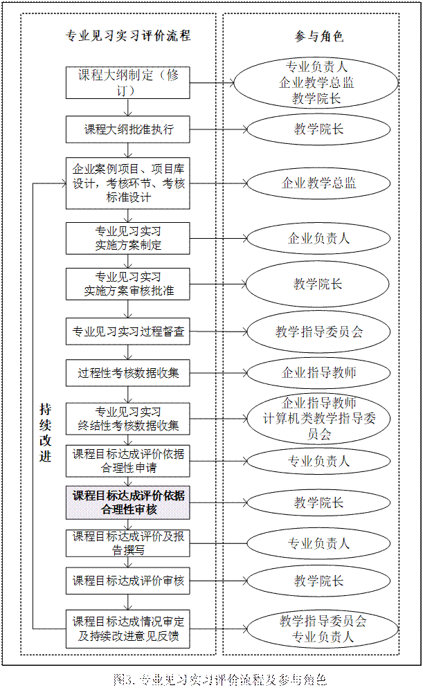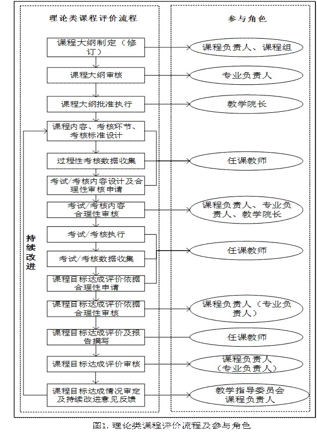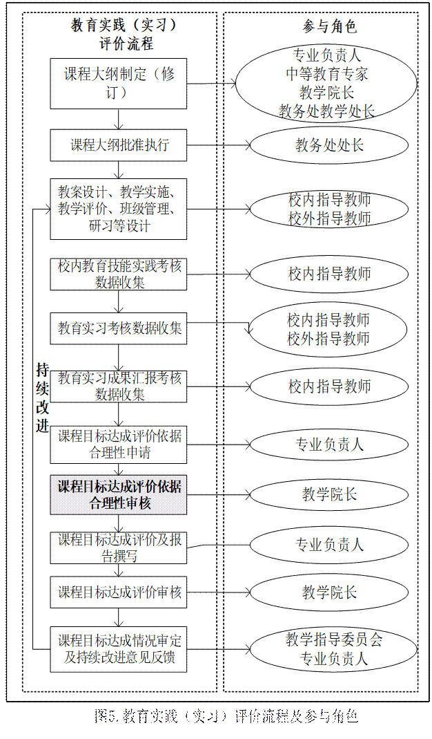 课程评价小组由任课教师、课程负责人、专业负责人、本科教学指导委员会和教学督导组成,其中教学督导负责课程档案材料审核和教学过程质量监控,不直接参与课程目标达成情况评价。根据理论类课(包括企业实训课、实验课)、课程设计、专业见习实习、教育实践(见习实习研习)、毕业论文(设计)不同教学环节,制定不同的评价流程和参与角色。图1所示为理论类课(包括企业实训课、实验课)评价流程和参与角色,图2为课程设计/综合课程设计评价流程和参与角色,图3给出专业见习实习评价流程和参与角色,图4为毕业论文(设计)评价流程和参与角色,图5是教育实践(实习)的评价流程和参与角色,图6给出教育实践(见习研习)的评价流程和参与角色。
