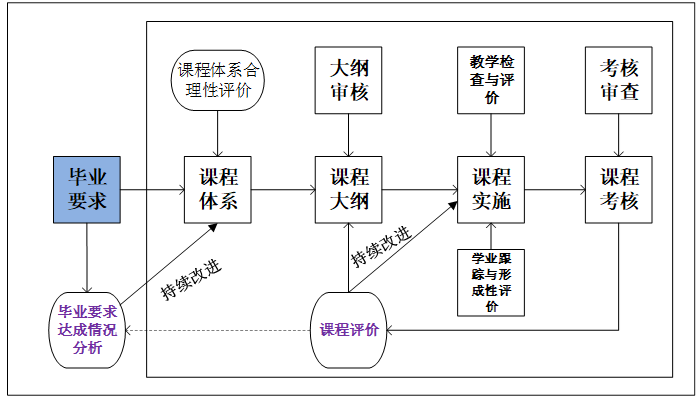 本专业教学过程质量监控运行机制框架如图3所示,主要包括课程体系设置与合理性评价、课程教学大纲制定与审核、课程实施过程中执行的教学检查与评价、学业跟踪与形成性评价、课程考核与考核审查、课程评价等,其中课程评价作为课程持续改进的依据,课程体系合理性评价作为课程设置的依据。